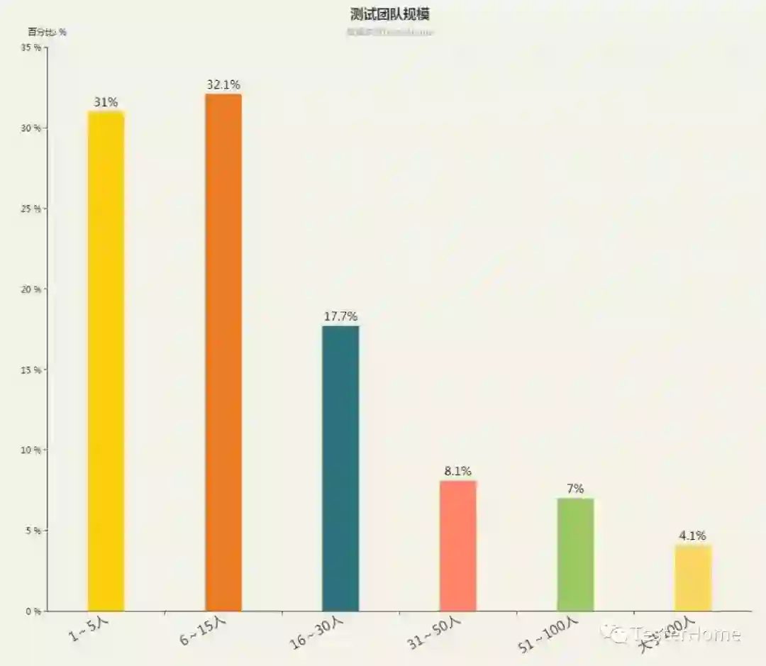 测试团队主要还是以小团队发展为主,大规模的测试部门应该主要分布在一些大厂中。 63%的测试团队的规模在 5-15 人,在团队合作和执行效率上,这种规模的团队协作会更 加灵活和机动。