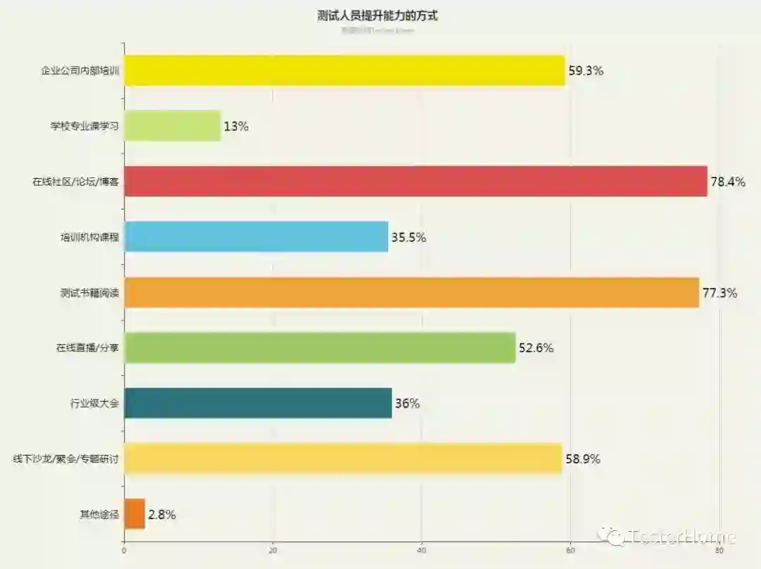 来了解一下测试同行们都是如何提升自己能力的吧。“社区论坛博客”和“测试书籍阅读”这两项排名靠前,欢迎多来社区发帖讨论,也多多参加社区组织的线下沙龙和技术聚会,共同学习互动。