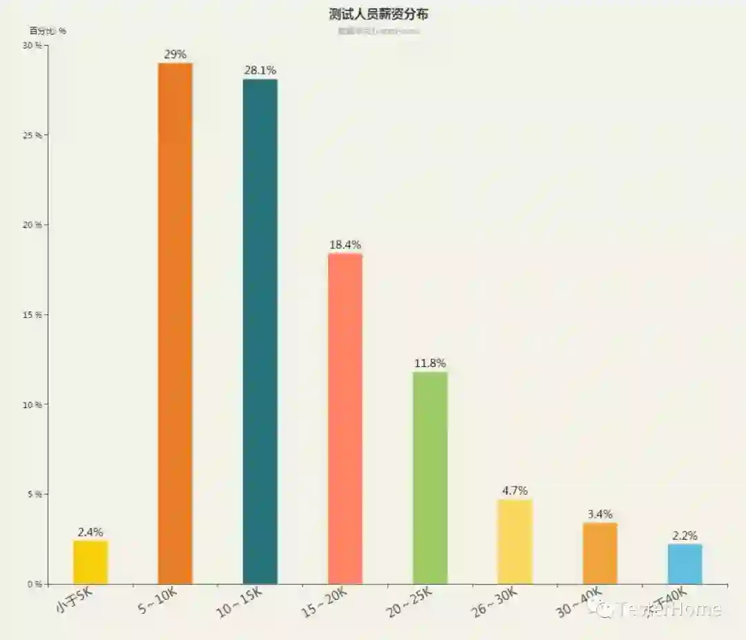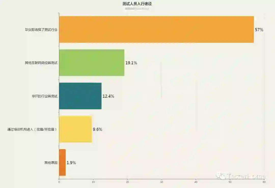 不过值得关注的是转行到测试的人员达到了 19.1%和 12.4%,而培训机构为测试行业输送的人才也占到了接近 10%。
