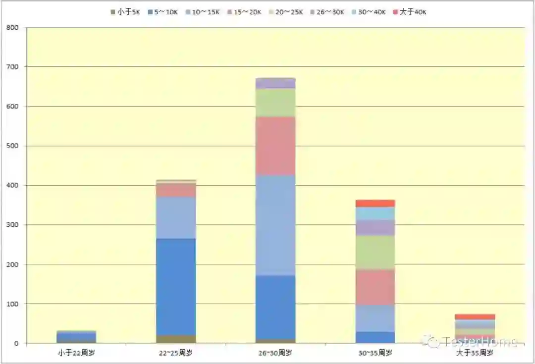 不要再纠结于 MM 匿名区的年薪百万了,我们来客观的了解一下行业的薪资分布,看看自己在行业里是什么样的水平。当前的数据有 70%的人群来自一线城市,而超过 50%的 人薪资主要分布在 5-15K 的区间,近几年来由于媒体过度曝光各大公司的校招生薪资动辄 22K 起,希望各位测试同学能够客观的看待测试行业当前的薪资状况。我们同时整理了一份薪资分布和年龄的关系图,供大家参考。