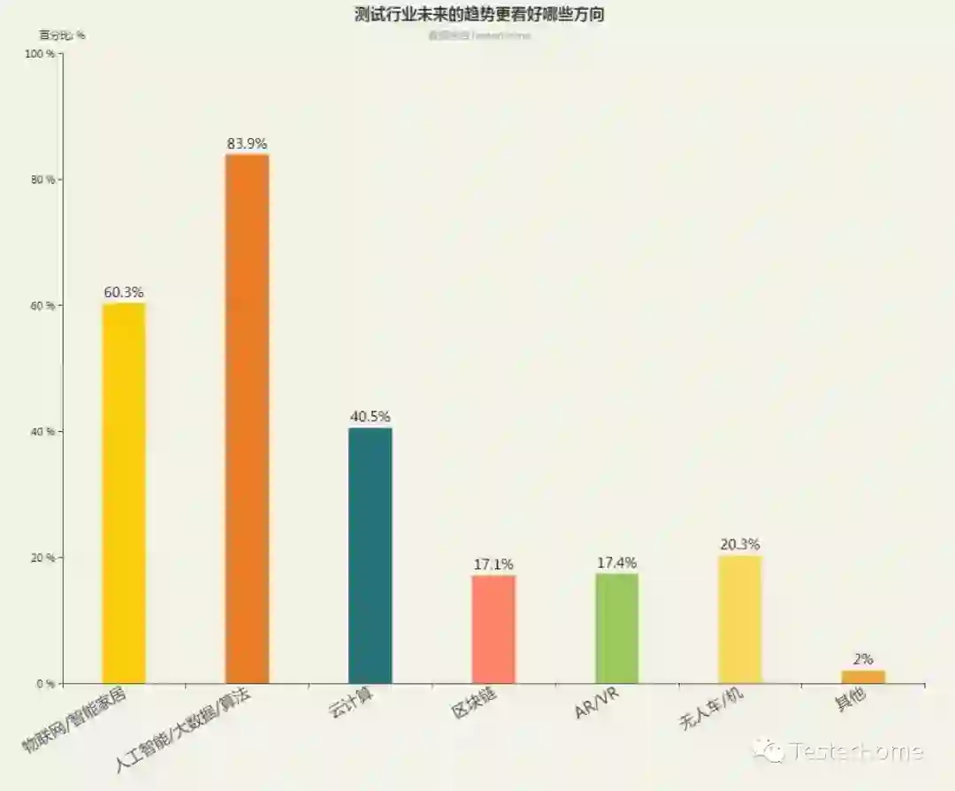 行业发展趋势往往跟随热点来的,就近 2 年来说,AI 和机器学习被看好是情理之中,IoT 行业的快速发展也给测试行业带来了不一样的挑战,大家在最近 2 年择业的时候可以参考一下这个数据。