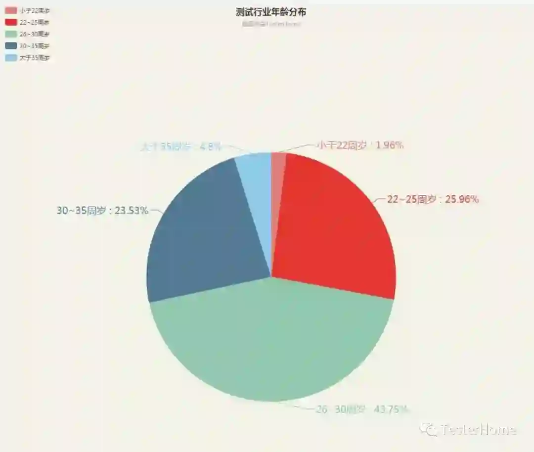 工作年限排第一的是工作 1-3 年的群体,测试行业整体的工作人群比较年轻化,也可能存在人员流动较大的因素在里面。与前面选项不太匹配的是年龄分布主要在 26-30 岁的区间,而工作经验的比例却并非 4-5 年居多,这个数据的差异推测是因为转岗导致的。