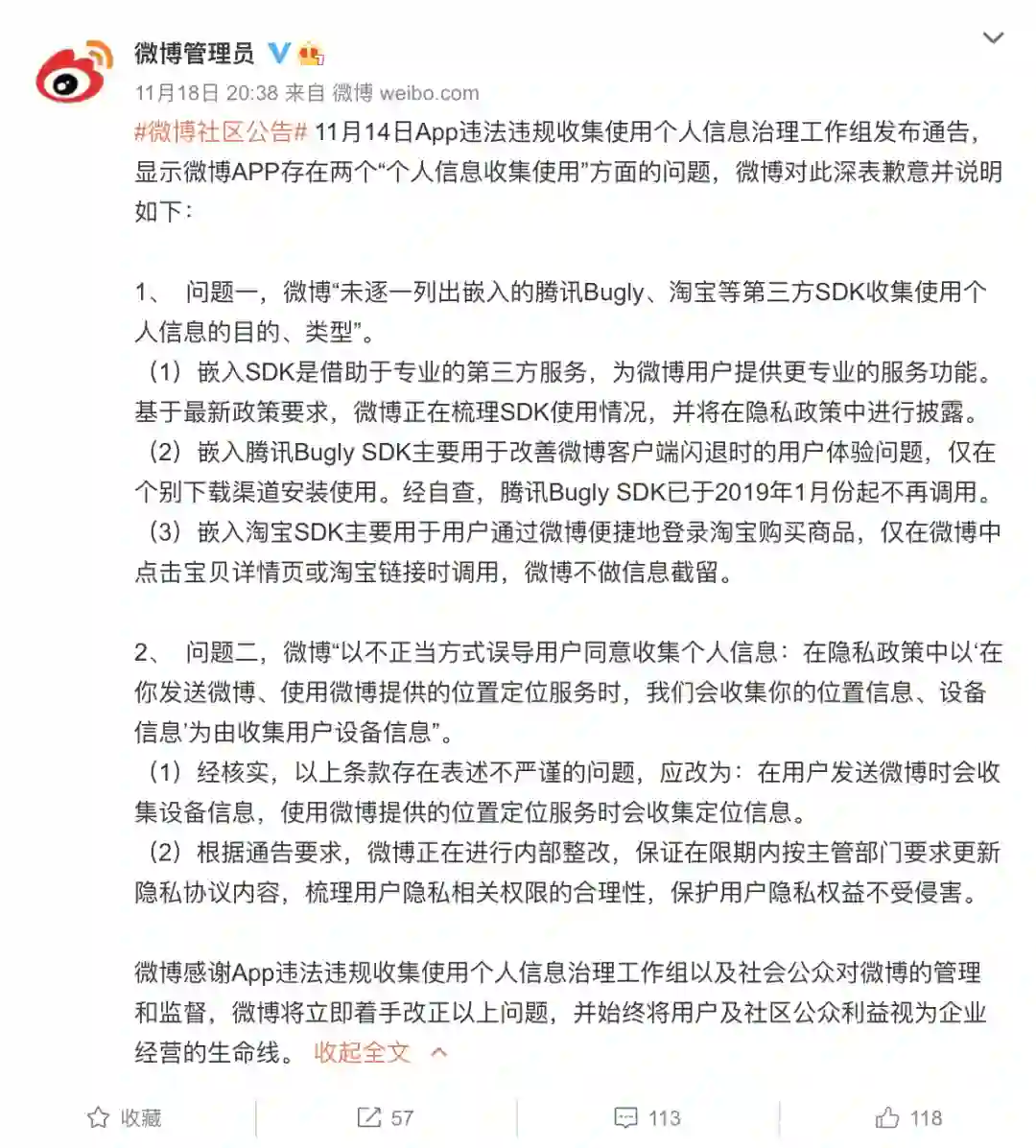 36氪获悉,新浪微博发布社区公告称,11月14日App违法违规收集使用个人信息治理工作组发布通告,显示微博App存在两个“个人信息收集使用”方面的问题,微博对此深表歉意。根据通告要求,微博正在进行内部整改,保证在限期内按主管部门要求更新隐私协议内容,梳理用户隐私相关权限的合理性,保护用户隐私权益不受侵害。