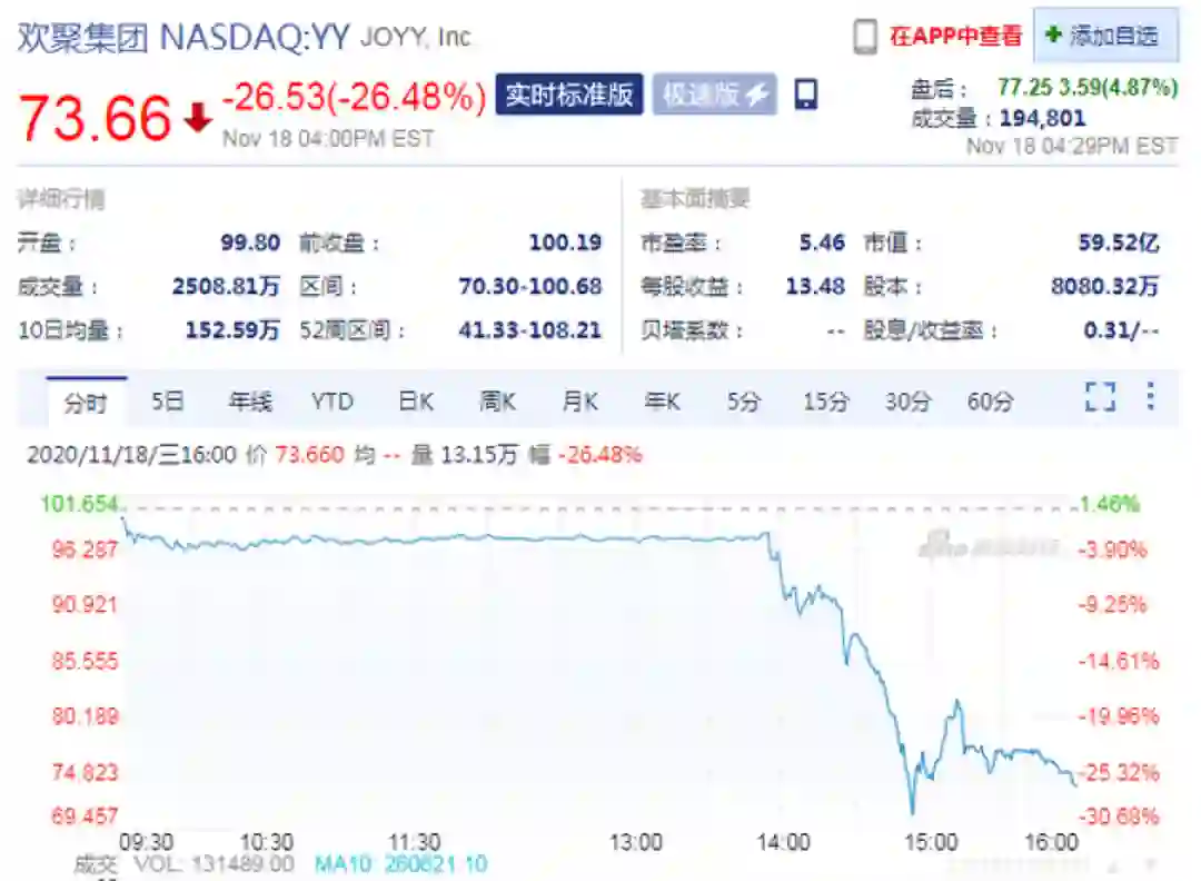 北京时间 11 月 19 日凌晨消息,周三收盘,欢聚集团股价暴跌 26.48%,报 73.66 美元。今天知名做空机构浑水公司做空中概股欢聚集团,浑水称调查显示 YY 直播有大约 90% 都是伪造数据。