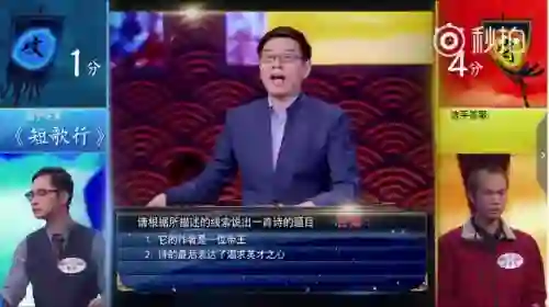 然而,彭敏却屡屡犯错,在面对给出的“作者是一位帝王”,“诗的最后表达了渴求英才之心”的提示,彭敏居然给出了《短歌行》的答案。评审老师康震直说,“昏了头了吗?曹操是帝王吗?”