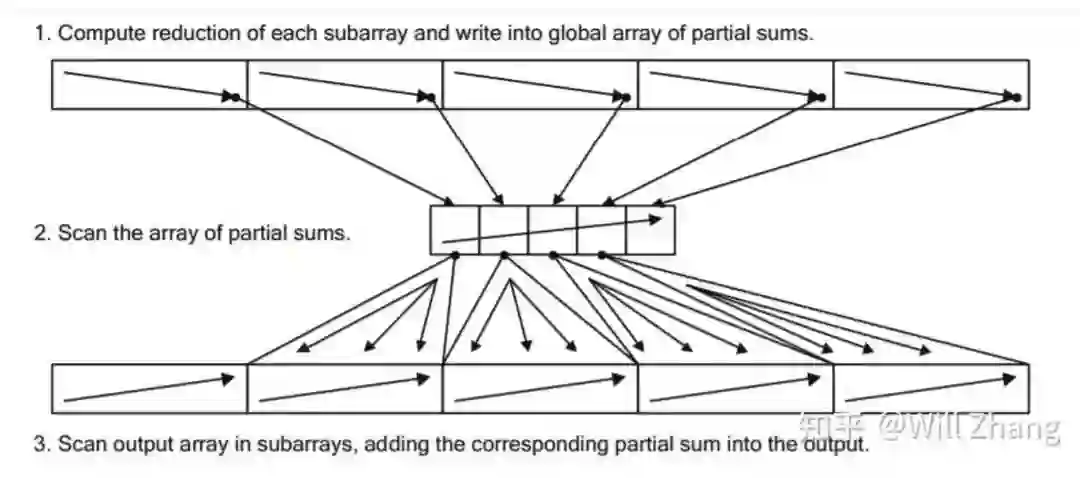 将存储在Global Memory中的数据分为多个Parts,每个Part由一个Thread Block单独做内部的Scan,并将该Part的内部Sum存储到Global Memory中的PartSum数组中