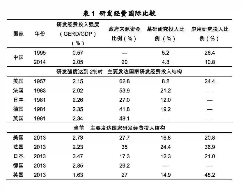 2005年,国家中长期科技发展规划战略研究专题报告指出:我国政府来源研发经费占全社会研发经费投入的比例,到 2010年逐步提高到40%左右,2011-2020年稳定在40%左右。2006年国家中长期规划实施以后,政府来源研发经费投入比例不升反降,2014年仅为20%,与主要发达国家历史同期和当前水平相比均严重偏低(参见表1)。