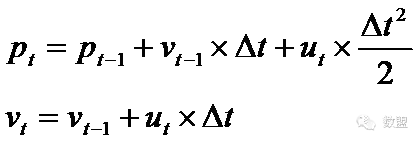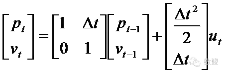 则我们可以得到,由t-1 时刻到 t 时刻,位置以及速度的转换如下: