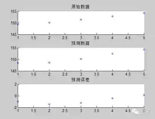 function testKF%% clc close all%%%data = load('D:\\a.txt');%data = [149.360 , 150.06, 151.44, 152.81,154.19,157.72,157.47,159.33,153.66];data = [149.360 , 150.06, 151.44, 152.81,154.19 ,157.72];[predData , DataX] = KF(data'); error = DataX(1,:) - data;i = 1:length(data); figure subplot 311scatter(i,data,3),title('原始数据') subplot 312scatter(i,DataX(1,:),3),title('预测数据') subplot 313scatter(i,error,3),title('预测误差') predData(1)%{scatter(i,error,3); figure scatter(i,data,3) figure scatter(i,predData(1,:),3)%}end