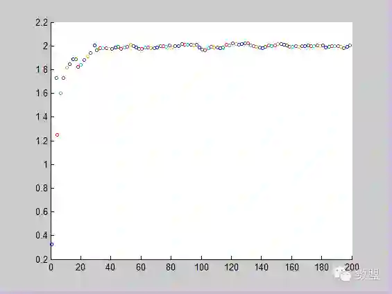 在代码中,我们设定x的变化是 1:2:200,则速度就是2,可以由上图看到,值经过几次迭代,速度就基本上在 2 附近摆动,摆动的原因是我们加入了噪声。