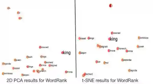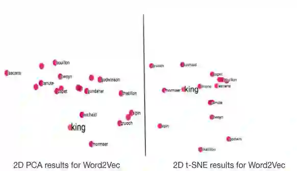 从图3可以看出,在Word2Vec模型中,两种方法都表现不错。要注意的是,由于t-SNE是一种随机方法,所以即使是使用相同的参数设置,也可能得到不同结果。在FastText中,两种方法表现相似,稍次于Word2Vec。在WordRank模型上 ,t-SNE方法效果好于PCA,因为在PCA方法中,一些最相似的词反而在图中被置于较远的位置。