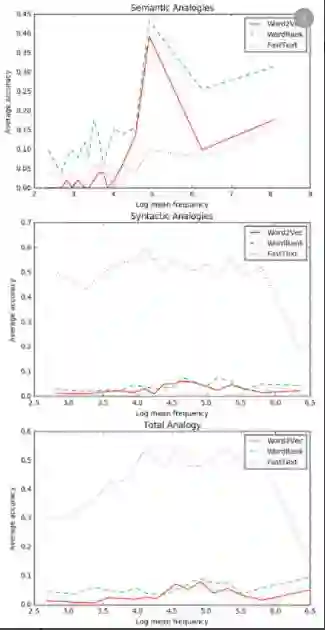 2.在语法类比中,FastText优于Word2Vec和WordRank 。FastText模型在低频词语上表现的相当好,但是当词频升高时,准确率迅速降低,而WordRank和Word2Vec在很少出现和很频繁出现的词语上准确率较低;