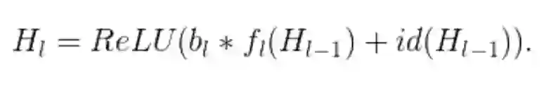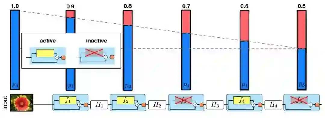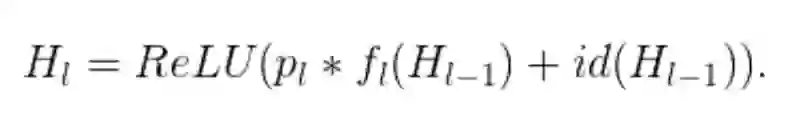 从形式上来看,H_l 是第 l 个残差块的输出结果,f_l 是由第 l 个残差块的加权映射所决定的映射,b_l 是一个伯努利随机变量(用 1 或 0 反映该块是否被激活)。在训练中: