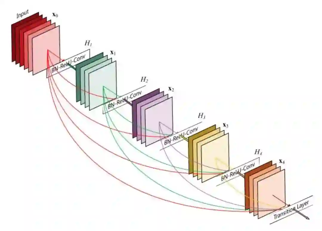 Huang 等人在论文 [9] 中提出一种新架构 DenseNet,进一步利用快捷连接,将所有层直接连接在一起。在这种新型架构中,每层的输入由所有之前层的特征映射组成,其输出将传输给每个后续层。这些特征映射通过深度级联聚合。