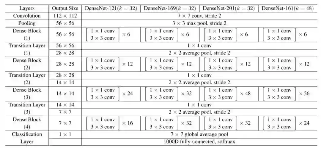 遵循该范式,我们知道第 l 层将具有 k *(l-1)+ k_0 个输入特征映射,其中 k_0 是输入图像的通道数目。作者使用一个叫作「增长率」的超参数 (k) 防止网络过宽,他们还用了一个 1*1 的卷积瓶颈层,在昂贵的 3*3 卷积前减少特征映射的数量。整体架构如下表所示: