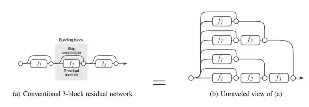 [14] 首先介绍了一个 ResNet 的分解图来使讨论更加清晰。在我们展开网络架构之后,很明显发现,一个有着 i 个残差块的 ResNet 架构有 2**i 个不同路径(因为每个残差块提供两个独立路径)。