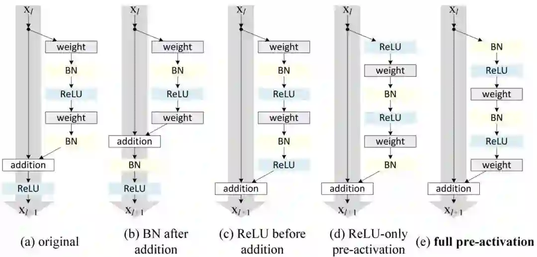 按照这种思路,[2] 的作者改进了残差块,并提出了一种残差块的预激活变体 [7],梯度可以在该模型中畅通无阻地通过快速连接到达之前的任意一层。事实上,使用 [2] 中的原始残差块训练一个 1202 层的 ResNet,其性能比 110 层的模型要差。