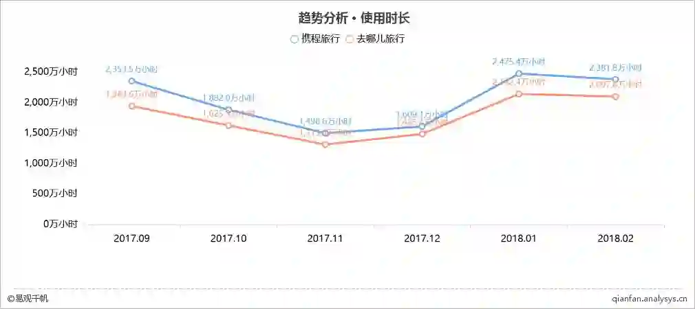 2017年9月-2018年2月携程旅行、去哪儿旅行APP使用时长趋势