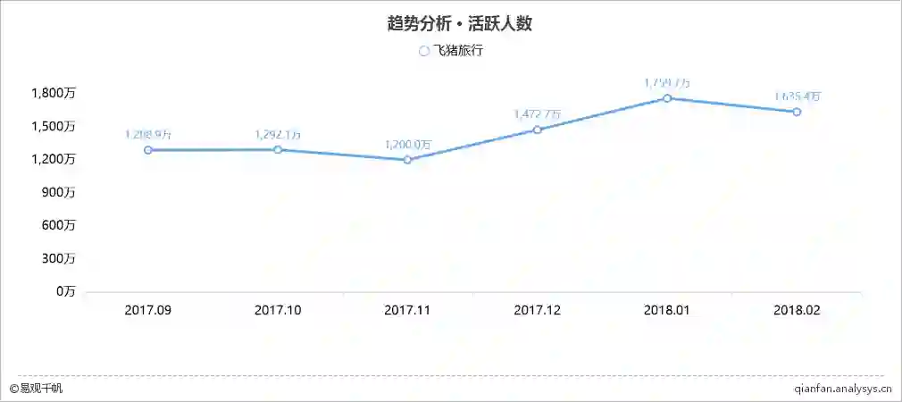 2017年9月-2018年2月飞猪旅行APP月活趋势
