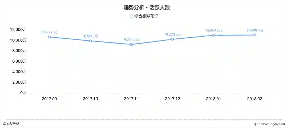 2017年9月-2018年2月综合旅游预订应用月活趋势