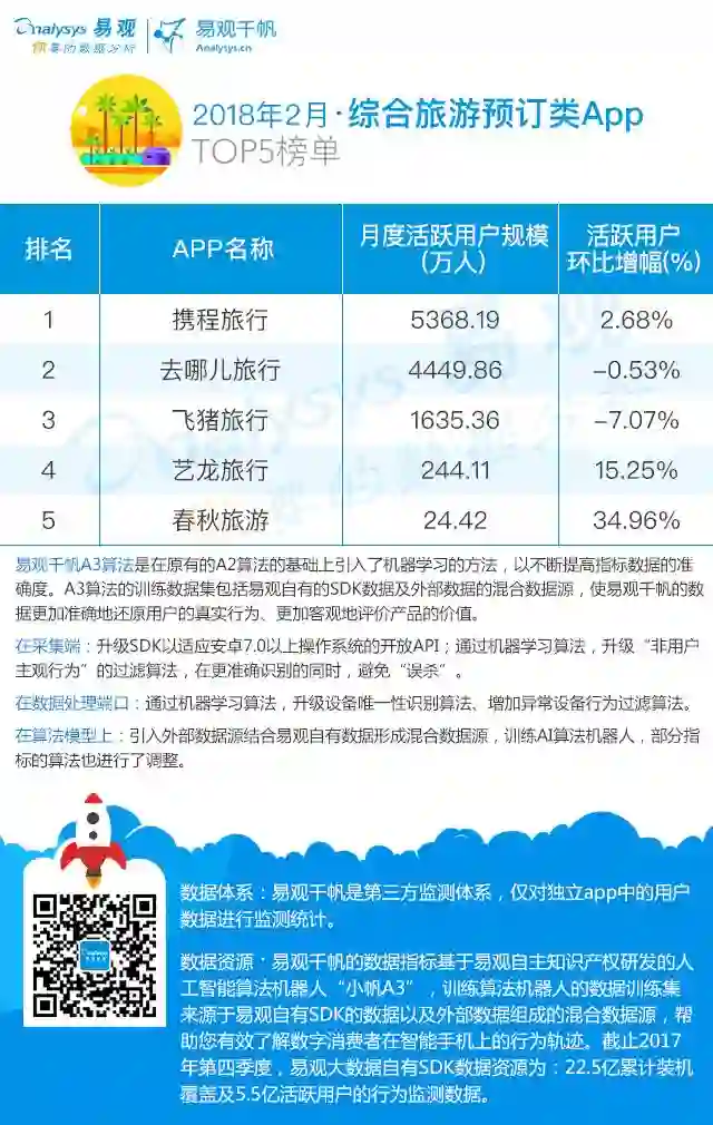 在2018年2月最新综合旅游预订APP排行榜中,携程旅行以5368.2万活跃用户排名第一,去哪儿旅行和飞猪旅行位列第二、第三。