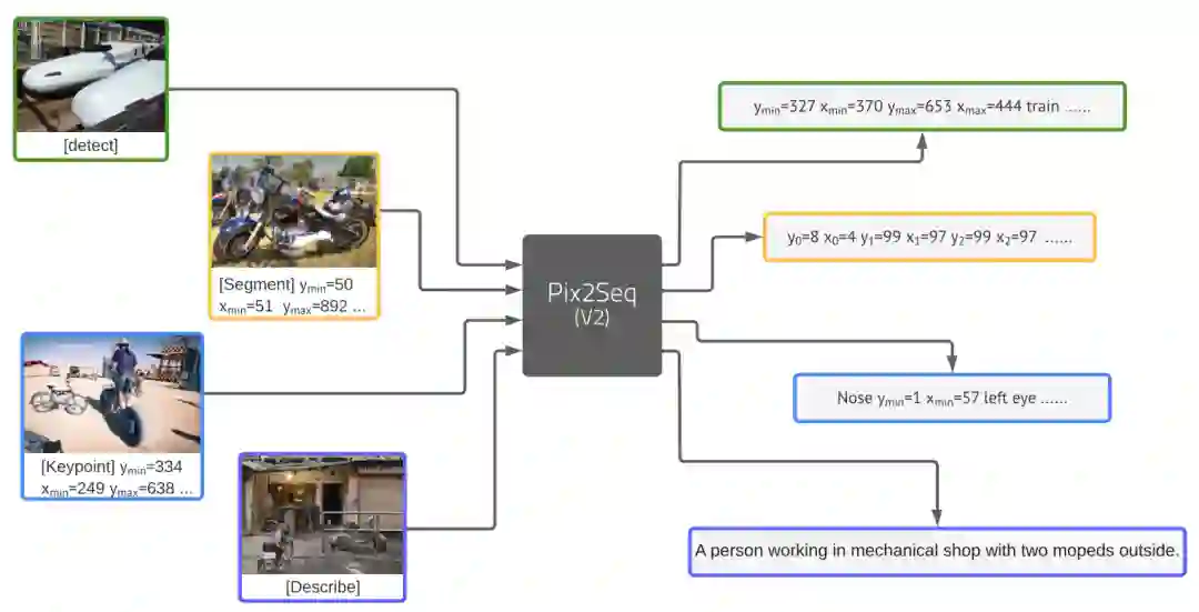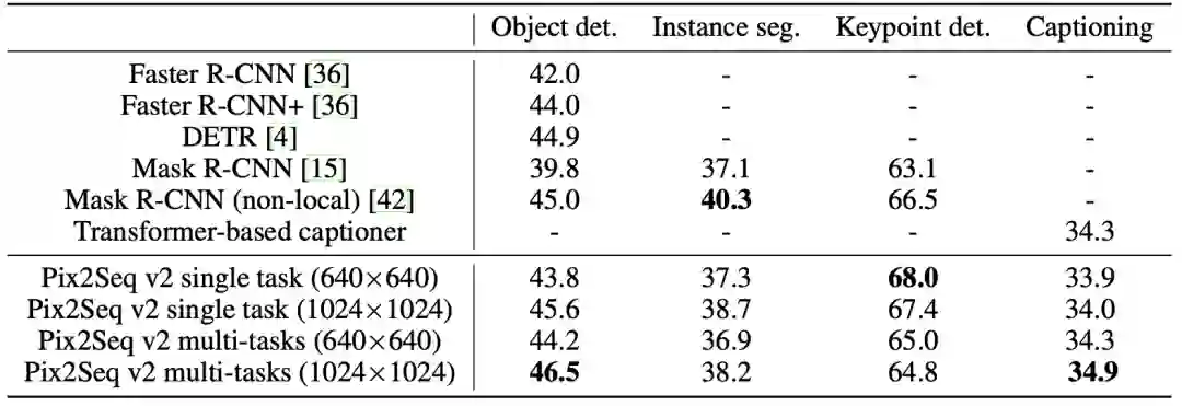 这篇工作的模型架构和第一版的Pix2Seq基本一致,重点在于怎样将这种框架adapt到多种不同输出形式的CV任务上。目前对各个CV任务的序列化非常直观简单,但效果却是不错的。