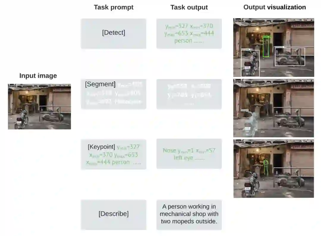 输入是一张image;输出是一个离散的token sequence:task prompt + task output,其中task prompt用于描述具体任务(一般是任务指令+additional input tokens),task output是需要model生成的部分,是目标结果的序列化描述。例如对上述四个任务: