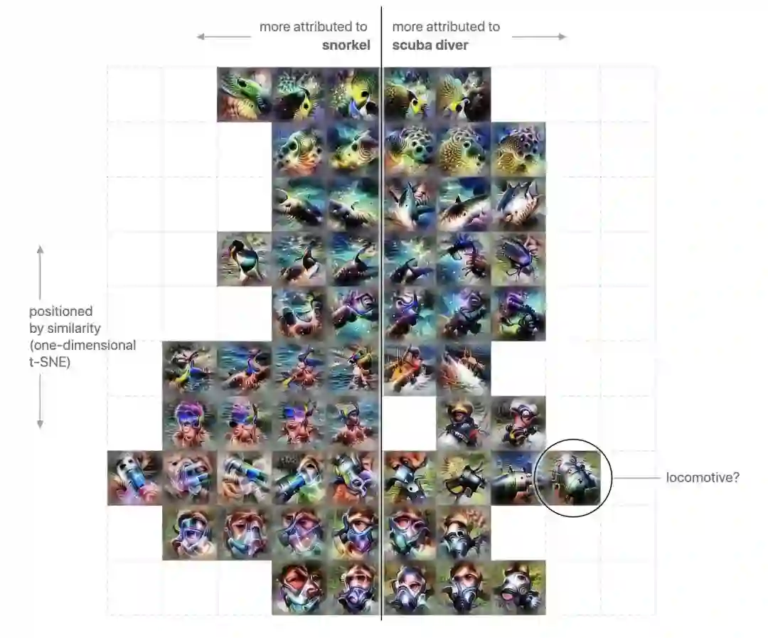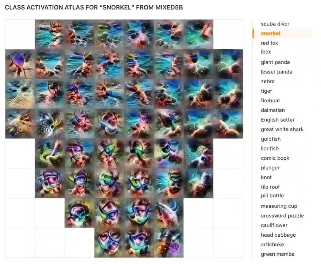 类激活图集使我们能够更清楚地了解网络使用哪些检测器对特定类进行排名。 在“呼吸管”示例中,我们可以清楚地看到海洋、水下和彩色面具。