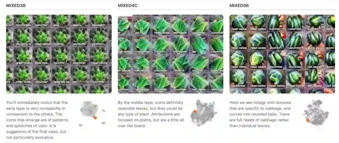 首先,让我们比较来自网络不同区域的三个层,以了解每个层的不同特征——mixed3b、mixed4c和mixed5b。我们将关注每层的有助于“卷心菜”分类的区域。