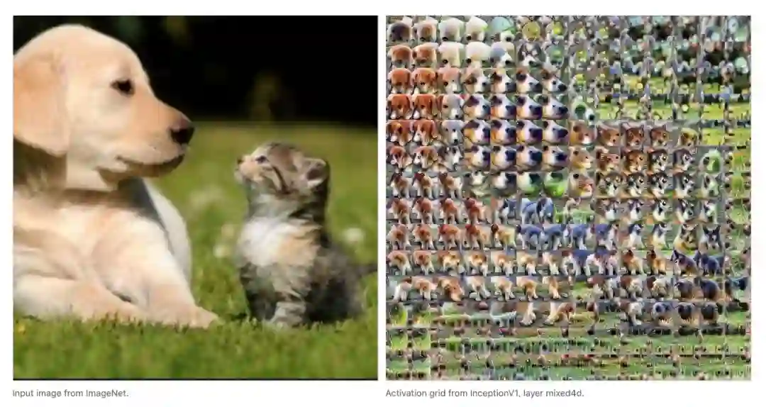 (左)从ImageNet输入的图像;(右)来自InceptionV1的激活网格,mixed4d层。