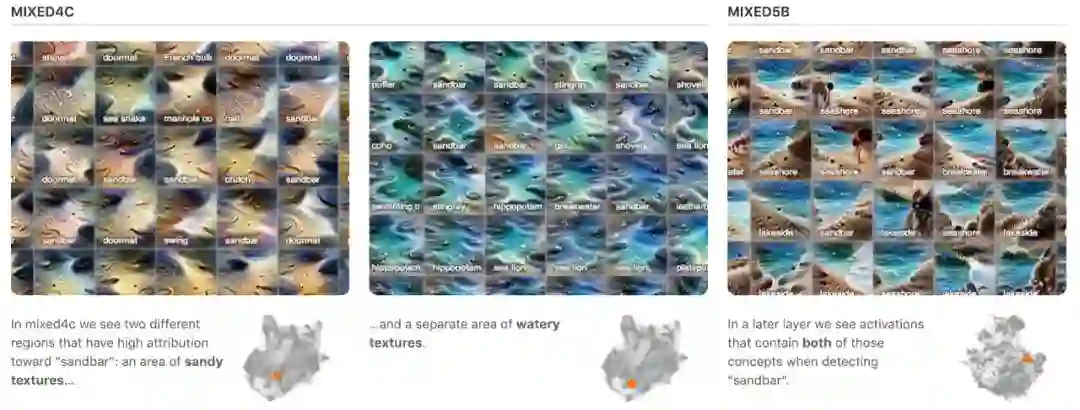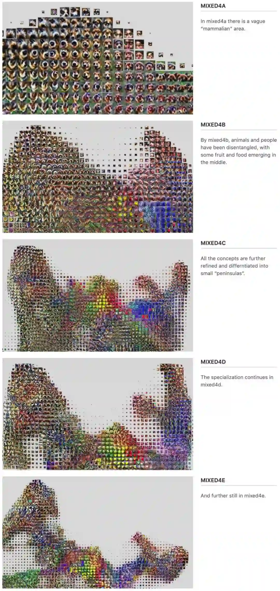 最后,如果我们缩小一点,我们可以看到更宽的激活空间的形状是如何从一层到另一层变化的。通过在几个连续的层中观察相似的区域,我们可以看到概念得到细化和区分——在mixed4a中,我们看到非常模糊的通用blob,通过mixed4e将其细化为更加具体的“半岛”。