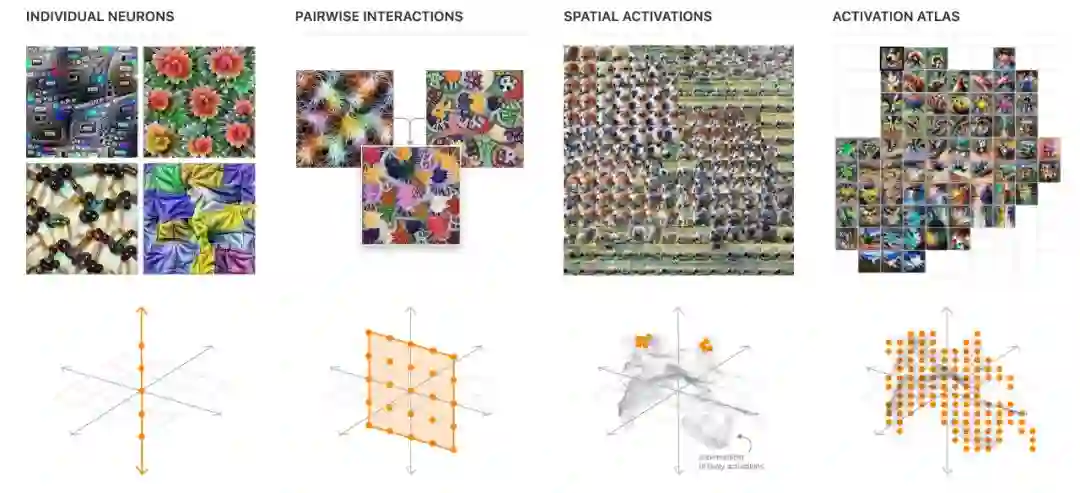 (单个神经元)单个神经元的可视化使隐藏层变得有意义,但是忽略了神经元之间的交互作用——它只向我们展示了高维激活空间的一维正交探针。(成对交互)成对的交互揭示了相互作用的效果,但它们只显示了具有数百个维度空间的二维切片,而且许多组合是不现实的。(空间激活)空间激活通过对可能激活的子流形进行采样来向我们显示许多神经元的重要组合,但它们仅限于给定示例图像中出现的那些神经元。(Activation Atlas)通过对多种可能的激活进行采样,Activation Atlase为我们提供了一个更全面的概览。