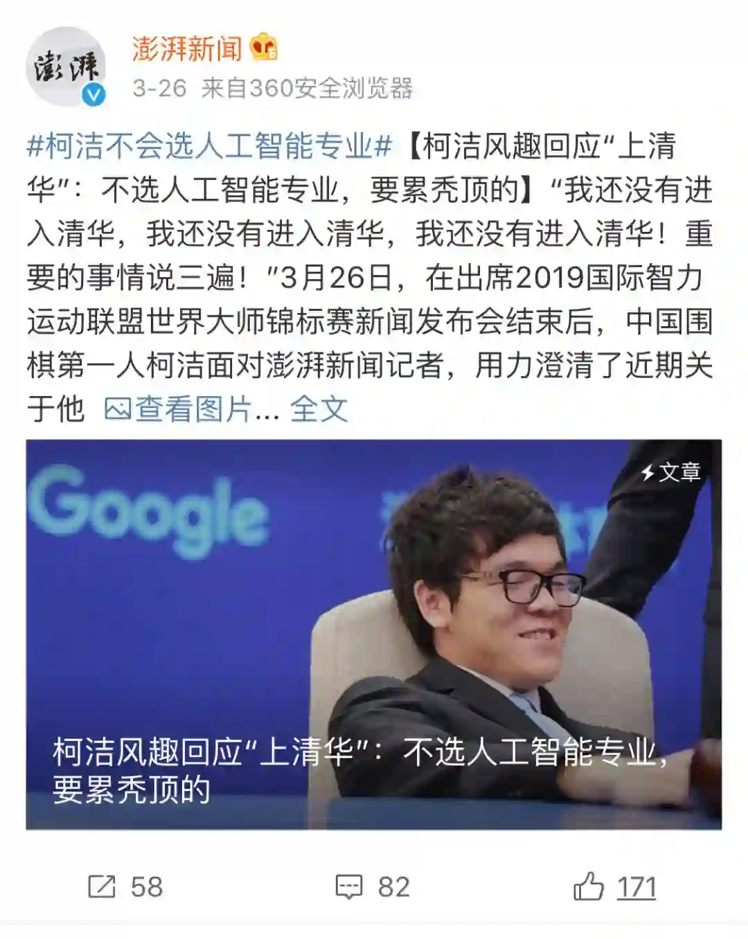 不过,据澎湃新闻报道,近日柯洁也在风趣回应了大家对于他近期要去清华是不是要读“人工智能”专业的关注:不选人工智能专业,要累秃顶的。“所以,操心的网友可以散一散啦。