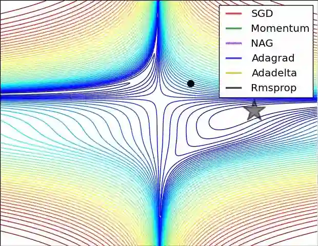 从上图可以看出, Adagrad、Adadelta与RMSprop在损失曲面上能够立即转移到正确的移动方向上达到快速的收敛。而Momentum 与NAG会导致偏离(off-track)。同时NAG能够在偏离之后快速修正其路线,因为其根据梯度修正来提高响应性。