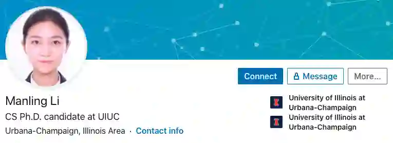 Manling Li 曾获得北京科技大学计算机科学硕士学位,在中国科学院大学取得了硕士学位。之后继续在美国伦斯勒理工学院深造,目前在伊利诺伊大学分校攻读博士学位。