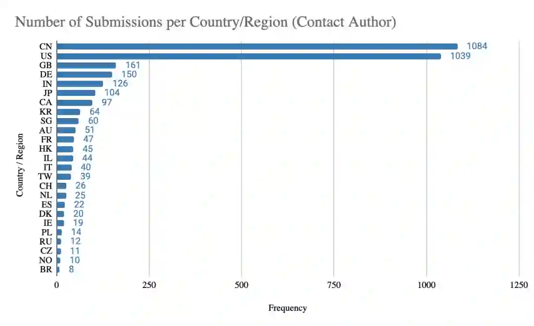今年论文接受情况,接受率最高的是以色列(40.9%)、英国(31.1%)、美国(29.4%)、德国(29.3%)。中国只有205篇被接收,比美国少了100篇。