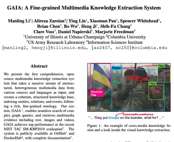这篇论文展示了第一个全面的、开源的多媒体知识提取系统。它将来自各种来源和语言的大量非结构化、异构的多媒体数据流作为输入,并根据丰富的、细粒度的本体去创建一个连贯的、结构化的知识库、索引实体、关系和事件。这个系统叫做GAIA,实现了对复杂图形查询的无缝搜索,并能够检索多媒体证据,包括文本,图像和视频。在最近的NIST TAC SM-KBP2019评估中,GAIA获得了最佳表现。