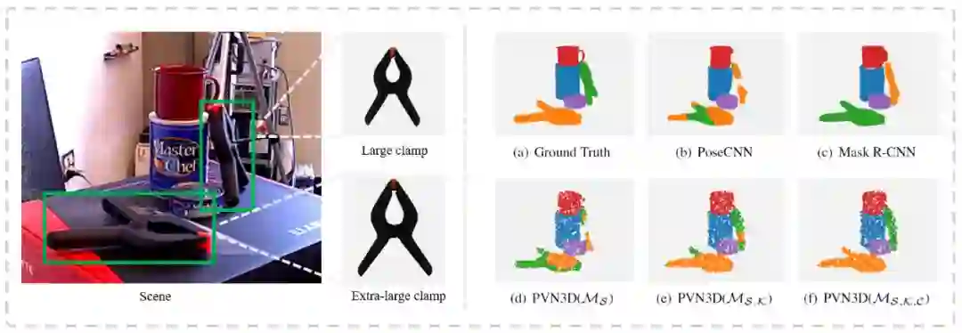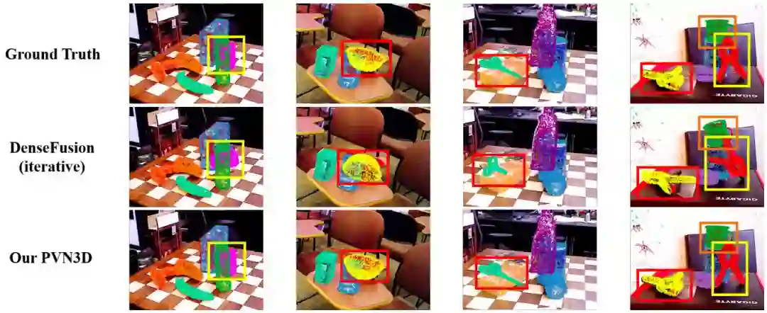 图 3 可视化了在YCB-Video数据集上的一些预测结果,PVN3D 比先前方法更准确。