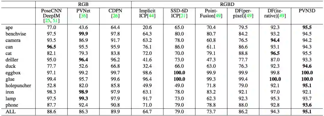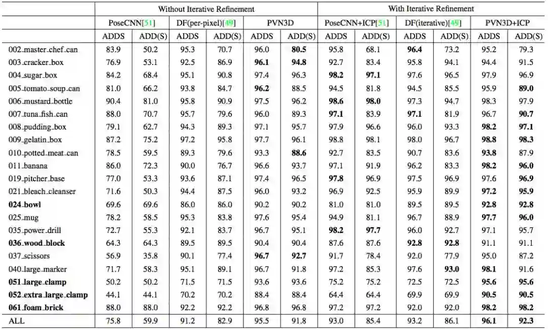 表 1 给出了在 YCB-Video 数据集上的量化评估结果。如表所示,本文方法(PVN3D)即使在没有借助任何迭代优化算法时也能大幅超越其他方法;而在迭代优化算法ICP 的加持下,本文方法(PVN3D+ICP)取得了更好的性能。