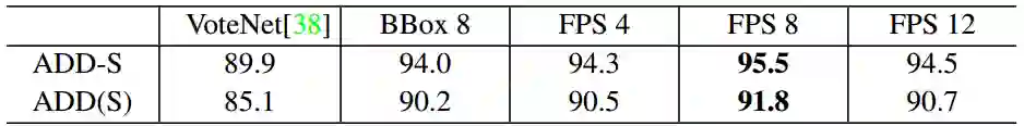 表 5 对比了不同关键点选择方式以及关键点数目对性能的影响,可见使用FPS算法选择的关键点优于3D检测框的8个角点,并且预测8个关键点是网络输出空间大小和最小二乘拟合位姿参数误差的一个较好的平衡。