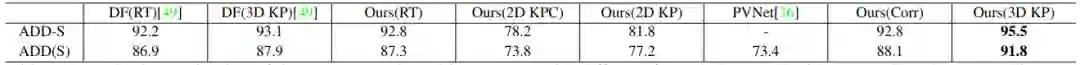 表 3 给出了在 LineMOD 数据集上的量化结果,本文模型同样取得当前最佳性能。