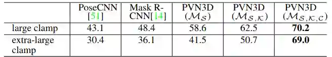 表 2 给出使用 ground truth 分割的评估结果,PVN3D 依然取得最佳性能。