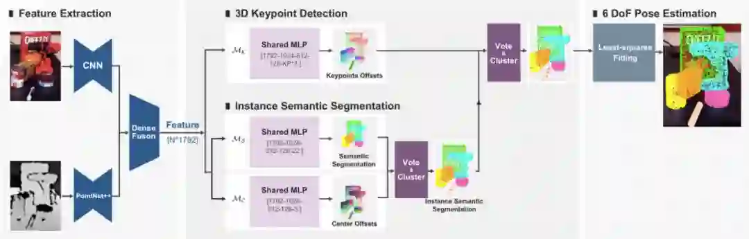 这是一种两阶段方法,在检测出物品的 3D 关键点之后使用最小二乘法拟合出位姿参数。具体而言,输入RGBD 图像,通过特征提取模块融合表面特征和几何信息获得逐点特征。这些特征被送至一个 3D 关键点检测模块以预测逐点到 3D 关键点的偏移(以投票出 3D 关键点)。