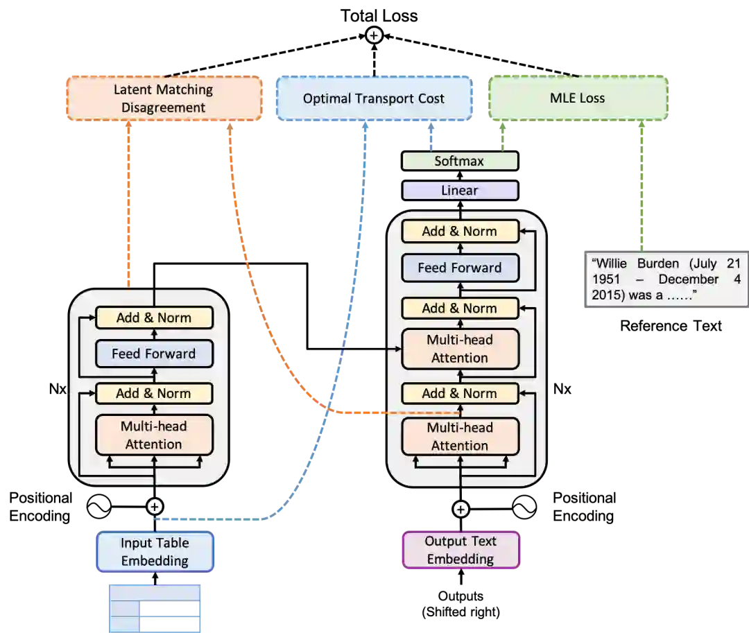 新提出的用于表格到文本生成任务的模型架构。为了生成多句式的忠实文本,其中的损失由三部分组成,包括一个最大似然损失(绿色),一个隐含匹配不一致损失(橙色)和一个最优-传输匹配损失。