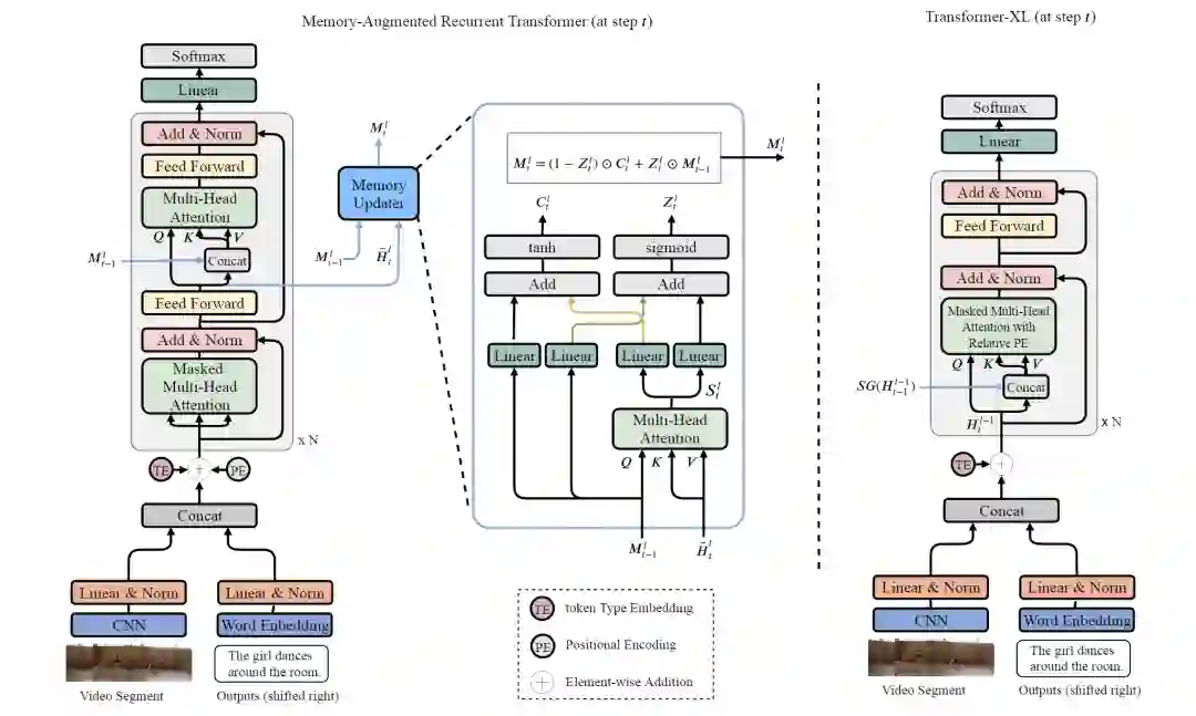 为视频生成多句子描述是最具挑战性的任务之一,因为它不仅对相关性而且对连贯性都有很高的要求。为了实现这一目标,本文提出了一种新的方法——记忆增强型循环 Transformer(MART)。MART使用记忆存储单元来增强 Transformer 架构,从而实现递归模型。记忆存储模块从视频片段和句子历史记录生成高度汇总的记忆状态,以帮助预测下一个句子,从而促进连贯段落的生成。大量的实验表明,与其它方法相比,MART 可以产生更连贯,避免重复的段落文字,同时保持相关性。