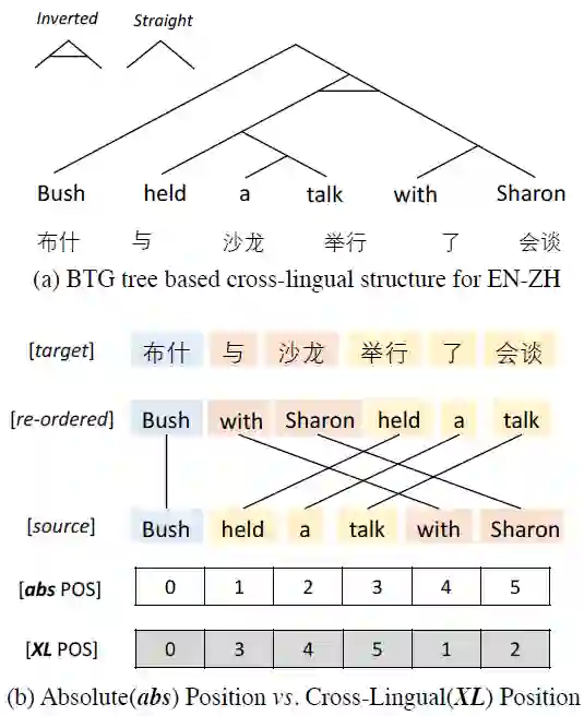 用于英中翻译任务的跨语言位置示意图。(a)展示跨语言预排序的括号转录语法(BTG)树。左上角是转录语法。(b)绝对位置编码(APE)与新提出的跨语言位置编码(XL PE)之间的差异。