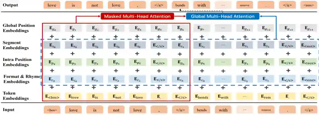 基于神经网络的文本生成在各种任务中取得了巨大的进步。大多数任务的一个共同特点是:在生成时,文本不受某些严格格式的限制。但是,我们可能会遇到一些特殊的文本范式,如歌词(例如给定乐谱配词)、十四行诗、宋词等。这些文本的典型特征有以下三个方面:(1)它们必须完全遵守预定的硬性格式。(2)它们必须遵守一定的韵律。(3)虽然受制于一些格式,但必须保证句子的完整性。就我们所知,基于预定义的硬性格式的文本生成还没有得到很好的研究。因此,本文提出了一个简单而优雅的框架 SongNet 来解决这个问题。该框架的骨干是一个基于 Transformer 的自回归语言模型。为了提高建模性能,研究者设计了多种符号来建模格式、韵律和句子的完整性。研究者也改进了注意力机制,促使模型捕捉到一些未来格式的信息。此外,研究者还设计了一个预训练和微调框架来进一步提高生成质量。在两个收集到的语料库上进行的大量实验表明,我们提出的框架在自动指标和人类评价方面都得到了明显更好的结果。