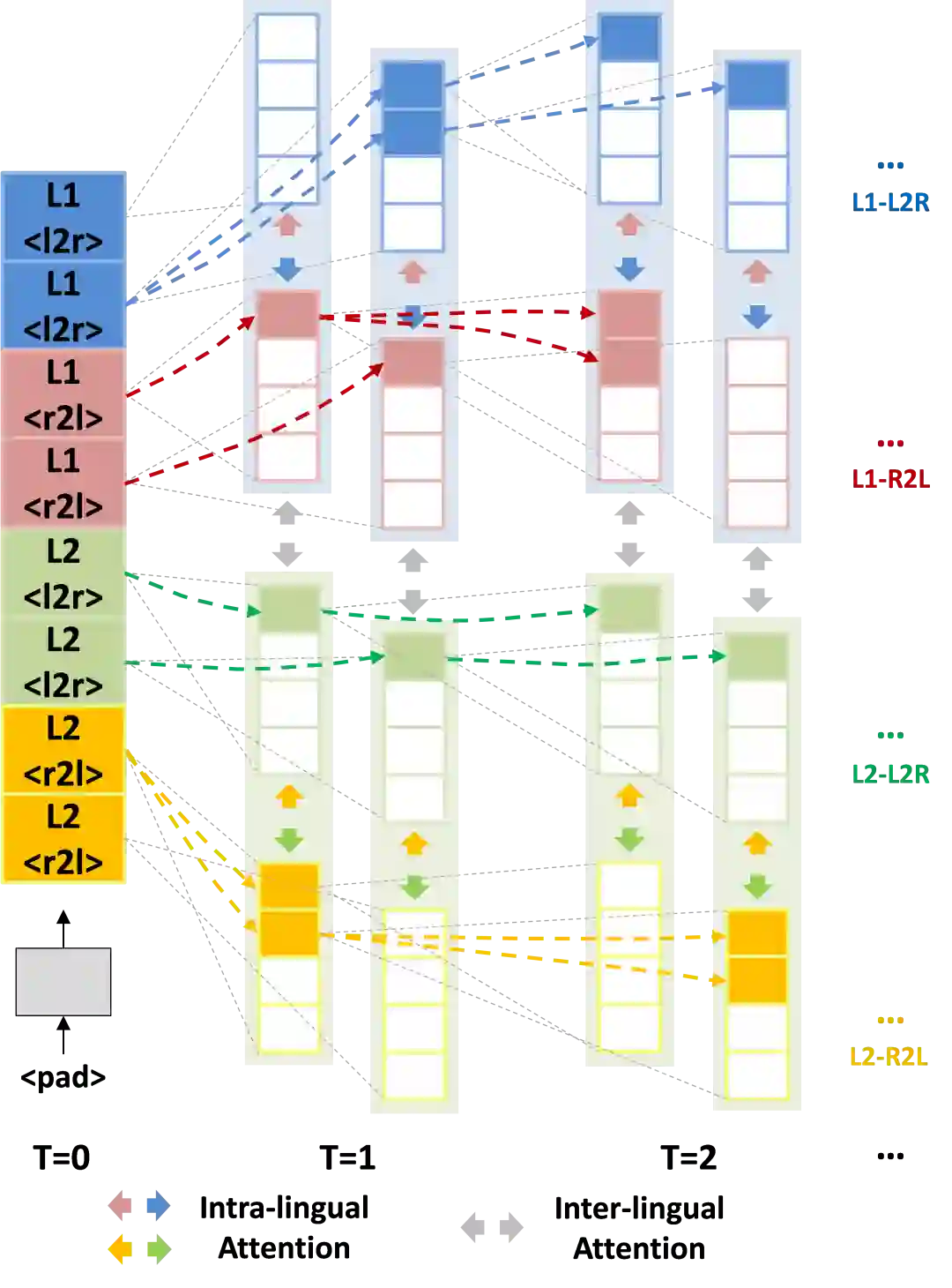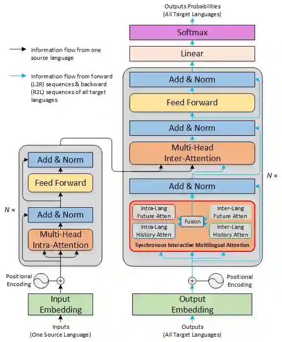 1)同步交互式多语言注意机制模块。让每一路的目标序列分别与语种内和语种间的历史信息、未来信息共4类信息执行注意力计算,得到4类注意力隐状态,再通过一个融合机制得到最终的隐状态输出。