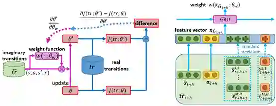 我们的工作考虑,根据每个生成样本对训练过程的影响来调整权重,从而,在抑制模型误差对训练过程的负影响的同时,最大化地利用生成样本。我们构建以下流程来调整权重:针对每个生成样本,首先,使用它来更新价值和策略网络;然后,在真实数据上计算神经网络更新前后损失值的变化;最后,根据损失值的变化调整该样本的权重。为了高效地实现这一权重调节机制,我们构建了一个权重预测网络,并按照上述流程对该网络进行训练:使用权重预测网络对一批生成样本进行权重预测,使用加权后的样本更新价值和策略网络,以更新前后损失值的变化作为优化目标,按照链式法则计算梯度并更新权重预测网络。