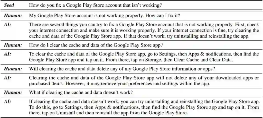自聊天的过程是训练内容的基础,为了让 ChatGPT 能够有效生成数据,研究人员应用一个模板来定义格式和要求,让 ChatGPT 的 API 持续为对话双方生成抄本,直到达到自然停止点。对话以「种子」为中心,「种子」可以是一个问题,也可以是设置聊天主题的关键短语。